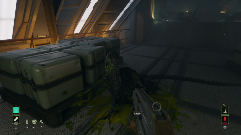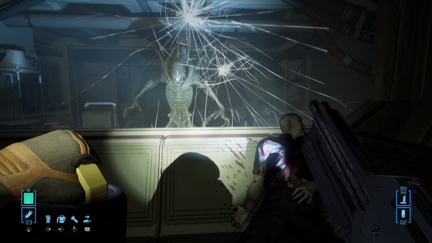 Да, враги могут вылезать из вентиляционных шахт и буквально валиться с потолка. Однако в остальном они способны лишь на сближение с протагонисткой, а любое препятствие для них чревато не только ступором, но и причудливыми багами. Ещё далеко не всех порадует бесконечный респаун противников — он происходит, например, если вы пытаетесь открыть запертую дверь или долго копаетесь с головоломкой. Видов врагов здесь всего два: ксеноморфы и лицехваты, которых нужно отстреливать с расстояния либо сбрасывать с себя в QTE. Босс встретится только один, и сражение с ним крайне скучное.