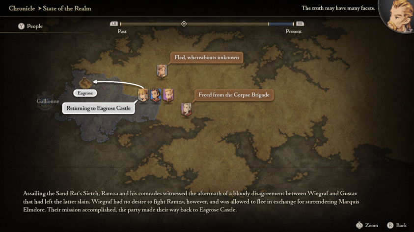 Достоинств у FF Tactics много, и в ремейке они остались без существенных изменений. В частности, не стали переписывать историю, которая ещё на релизе впечатляла игроков проработкой персонажей, масштабами конфликтов и политическими интригами, за которыми увлекательно наблюдать. Только теперь абсолютно все сюжетные реплики озвучены профессиональными актёрами, включая Бена Старра (Ben Starr), который полюбился фанатам после роли Клайва в Final Fantasy XVI.