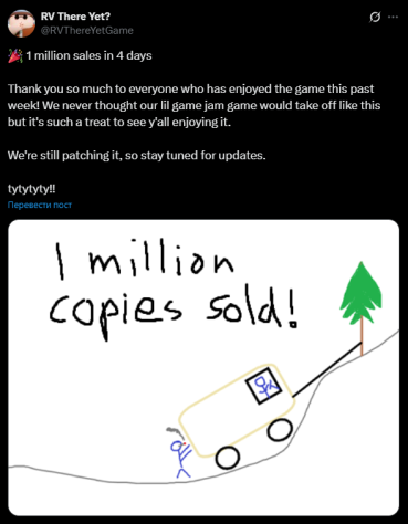 Как похвалились разработчики из Nuggets Entertainment, RV There Yet? разошлась тиражом в 1,29 миллиона копий быстрее, чем за неделю. «Большое спасибо всем, кто веселился в игре на этой неделе! Никогда бы не подумали, что наш небольшой проект, сделанный на джем-сессии, так высоко взлетит», — гласит послание от команды.